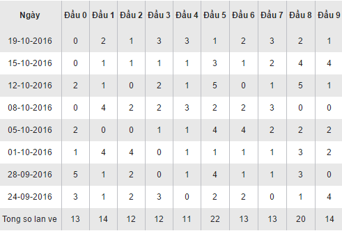 Hai đầu 1 và 9 đều có 14 về , trong khi 3 đầu 0,6 và 7 chỉ có 13 lần xuất hiện. Đồng sở hữu 12 lần xuất hiện là hai đầu 2 và 3, còn lại là đầu 4 xếp chót bảng với 11 lần về trong 30 ngày trở lại đây.