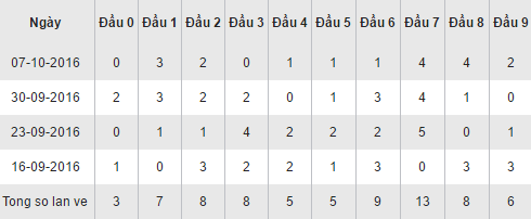 Quan sát bảng thống kê các cặp loto theo đầu số trên đây của XSNT ta thấy, đầu 7 đang giữ ưu thế lớn nhất với 13 lần xuất hiện trên bảng kết quả, trong đó có 1 ngày thăng hoa về với 4 lần (ngày 23/09/2016). Theo sau là đầu 6 với 9 lần xuất hiện. Các đầu 2,3,8 về đồng loạt với 8 lần xuất hiện. Đầu 0 lần này ngậm ngùi đành xếp chót bảng với chỉ 3 lần về trong vòng 30 ngày quay gần nhất.