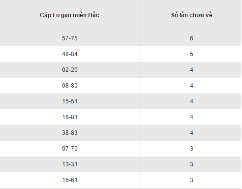 Sau kết quả XSMB ngày hôm qua, bảng kết quả loto gan XSMB vừa có sự thêm bớt các cặp số vừa có sự chuyển dịch về vị trí các cặp số cũ trong bảng, cặp loto 95 hiện tại đang là loto gan lì nhất khi có tới 13 lần quay chưa về. Cùng chờ đón kết quả XSMB hôm nay ngày 21/09/2016 để tiếp tục cập nhật những thay đổi của bảng loto gan miền Bắc nhé !