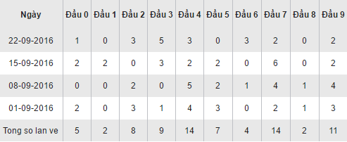 Quan sát bảng thống kê các cặp loto theo đầu số trên đây của XSAG trong 30 ngày gần nhất cho ta thấy, đầu 4 và 7 đang cùng chiếm ưu thế mạnh nhất với 14 lần xuất hiện trên bảng kết quả, trong đó đầu 7 có được 1 ngày thăng hoa nhất với 6 lần góp mặt (ngày 15/09/2016). Theo ngay sau là đầu 9 với 11 lần xuất hiện. Các đầu còn lại về đều đặn không có sự vượt trội nào, đầu 1 và 8 xếp chót khi chỉ sở hữu cho mình 2 lần về trong tháng.