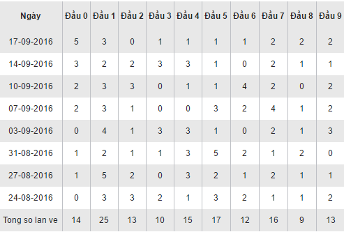 Quan sát bảng thống kê các cặp loto theo đầu số trên đây của XSDNA trong 30 ngày gần nhất cho ta thấy, đầu 1 đang chiếm được ưu thế mạnh nhất với 25 lần xuất hiện trên bảng kết quả trong 30 ngày gần nhất, trong đó có được một ngày thăng hoa nhất với 5 lần góp mặt (ngày 27/08/2016). Theo ngay sau là đầu 5 với 17 lần xuất hiện. Các đầu còn lại về đều đặn không có sự vượt trội nào, xếp chót khi chỉ sở hữu cho mình 9 lần về trong tháng đó là đầu 8.