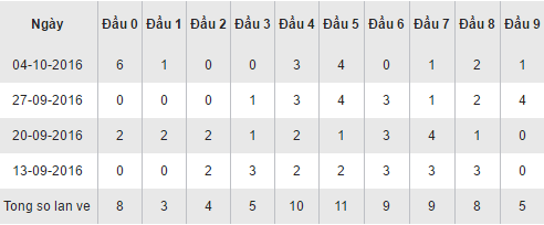 Quan sát bảng thống kê các cặp loto theo đầu số trên đây của XSQNA trong 30 ngày gần nhất ta thấy, đầu 5 đang chiếm ưu thế với 11 lần xuất hiện trên bảng kết quả, trong đó có 2 ngày thăng hoa về với 4 lần góp mặt (ngày 27/09/2016 và 04/10/2016). Theo ngay sau là đầu 4 với 10 lần xuất hiện. Các đầu còn lại về đều đặn và không có sự vượt trội nào, duy chỉ có đầu 1 ảm đạm xếp chót khi chỉ sở hữu cho mình 3 lần về trong vòng một tháng qua.