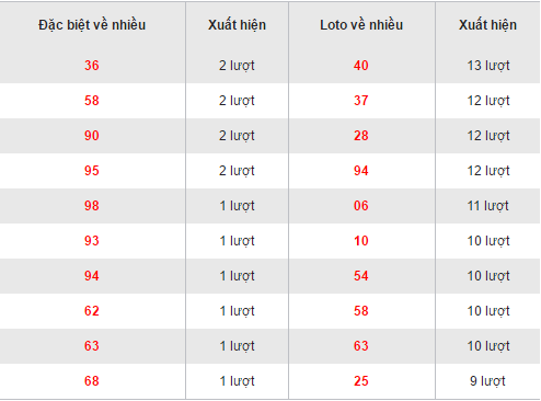 Theo như quan sát bảng thống kê trên, bộ số 40 đang dẫn đầu với 13 lần xuất hiện, ngày về gần đây nhất vào 01/08/2016. Tiếp theo đó là các bộ 37,28,94 đều sở hữu 12 lần về, bộ 06 với 11 lần về . Có 4 bộ số đều có 10 lần góp mặt đó là các bộ 10-54-58-63. Xếp chót bảng với 9 lần xuất hiện là bộ số 25.