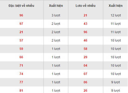 Quan sát bảng thống kê các cặp loto về nhiều của XSAG trên đây ta thấy, bộ số 21 đang dẫn đầu bảng khi sở hữu 12 lần xuất hiện. Các bộ 43 và 96 thì đang sở hữu 11 lần xuất hiện trên bảng. Cùng sở hữu 10 lần xuất hiện trong 30 ngày quay gần đây nhất là các bộ 46, 58, 29, 04, 07. Hai bộ số còn lại trong bảng khiêm tốn hơn chỉ với 9 lần về trong tháng đó là 06 và 26. Giải đặc biệt về nhiều nhất là cặp 96 với 3 lần.