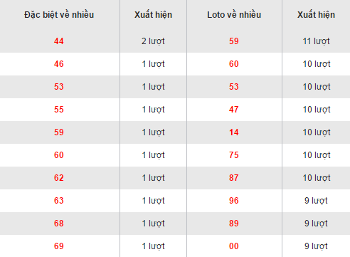 Ngoài các cặp loto thì tần suất xuất hiện của các cặp số giải đặc biệt cũng được cập nhật chi tiết với cặp 44 dẫn đầu số lần xuất hiện là 2 lần tính trong 30 ngày gần đây nhất.