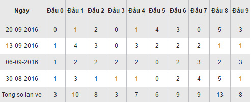 Bảng thống kê các cặp loto theo đầu số trên đây của XSVT trong 30 ngày gần nhất cho ta thấy, đầu 8 đang chiếm được ưu thế mạnh nhất với 13 lần xuất hiện trên bảng kết quả trong 30 ngày gần nhất, trong đó có được 2 ngày thăng hoa nhất với 5 lần góp mặt (ngày 30/08/2016 và 20/09/2016). Theo ngay sau là đầu 1 với 10 lần xuất hiện. Các đầu còn lại về đều đặn không có sự vượt trội nào, xếp chót khi chỉ sở hữu cho mình 3 lần về trong tháng đó là các đầu 0 và 3.