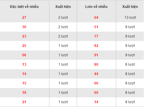 Bảng thống kê các cặp loto về nhiều của Xổ số Quảng Trị trên đây cho ta thấy, bộ số 64 đang dẫn đầu bảng với 13 lần xuất hiện. Các bộ 51, 77, 82, 91 thì đang sở hữu 9 lần xuất hiện trên bảng. Các đầu còn lại trong bảng đều cùng sở hữu 8 lần xuất hiện trong 30 ngày quay gần đây nhất, đó là các bộ 80, 44, 66, 60, 14.