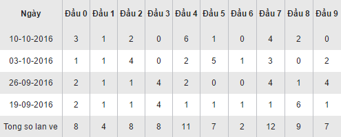 Quan sát bảng thống kê các cặp loto về theo đầu số trên đây của XSCM trong 30 ngày gần nhất ta thấy, ưu thế đang thuộc về đầu 7 với 12 lần xuất hiện trên bảng kết quả, trong đó có 2 ngày thăng hoa về với 4 lần (ngày 26/09/2016 và 10/10/2016). Bám đuổi sát nút ngay sau đó là đầu 4 với 11 lần xuất hiện trên bảng kết quả 30 ngày qua, lần về thăng hoa nhất là 6 lần trong ngày 10/10/2016. Đầu 8 khiêm tốn chỉ sở hữu 9 lần về nhưng lại có ngày thăng hoa nhất với 6 lần xuất hiện đó là ngày 19/09/2016. Đầu 6 ngậm ngùi đành xếp chót khi trong vòng 1 tháng qua chỉ chiếm chân trong 2 bộ số, thật đáng tiếc.