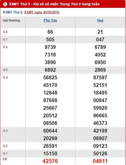 Trước khi đến với kết quả quay thưởng chiều nay của XSMT, anapaolaagudelo.com mời quý vị và các bạn cùng điểm lại tình hình kết quả Xổ số miền Trung các tỉnh Phú Yên, Huế ở lần quay trước thứ 2 ngày 26/09/2016 nhé!