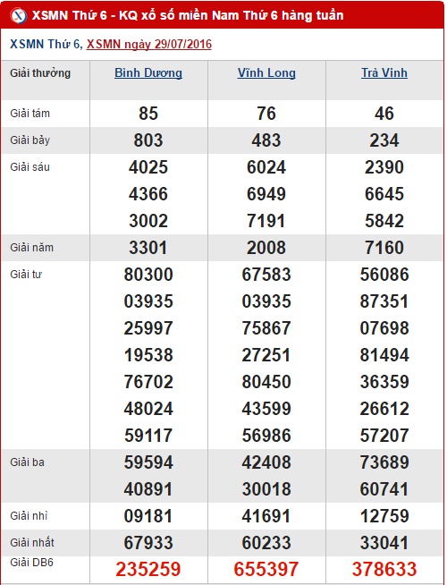 Đến hẹn lại lên, thứ 6 hàng tuần lượt quay thưởng của XSMN lại quay lại với người chơi ở các tỉnh Bình Dương, Vĩnh Long và Trà Vinh. Và như thường lệ, sau đây anapaolaagudelo.com xin gửi đến các bạn bài tổng hợp, thống kê kết quả XSMN lần quay trước nhé !
