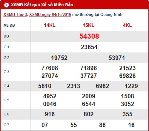 Tổng hợp số liệu kết quả XSMB hôm nay ngày 05/10/2016