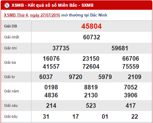 Tổng hợp số liệu kết quả XSMB hôm nay thứ 5 ngày 28/07/2016