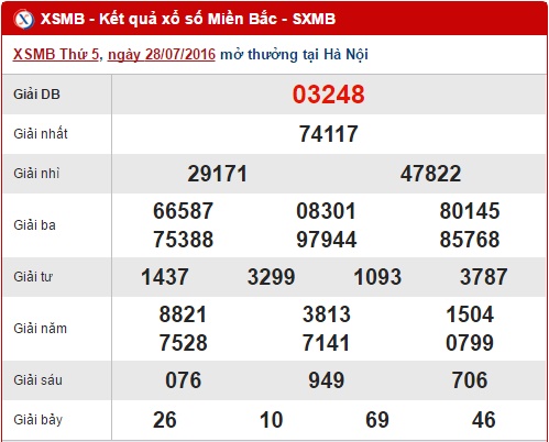 Như thường lệ, hôm nay Xo so mien Bac sẽ mở thưởng tại Hải Phòng và quay thưởng lúc 18h15 chiều nay. Trong khi chờ đợi kết quả, chúng ta sẽ tổng hợp và phân tích số liệu các kết quả ở lần quay trước nhé. Trước tiên hãy cùng Xoso.com.vn review lại kết quả XSMB thứ 5 ngày 28/07/2016.