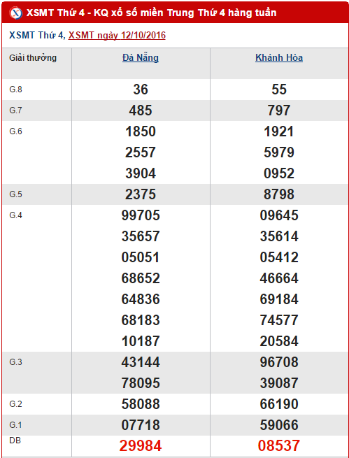 XSMT hôm nay mở thưởng tại các tỉnh Khánh Hòa và Đà Nẵng sau một tuần lễ quay vòng. Trong khi chờ kết quả quay thưởng chiều nay, anapaolaagudelo.com mời các bạn tham khảo nội dung thống kê kết quả XSMT tuần trước lần quay ngày 12/10/2016.