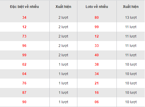 Quan sát bảng thống kê trên ta thấy, bộ số 80 đang dẫn đầu với 12 lần xuất hiện, ngày về gần đây nhất vào 04/08/2016. Tiếp theo đó là các bộ 99,12,33,40 đều sở hữu 11 lần về. Bộ 38,34,21,16 và 06 là các bộ số có 10 lần xuất hiện trong 30 ngày gần đây nhất.
