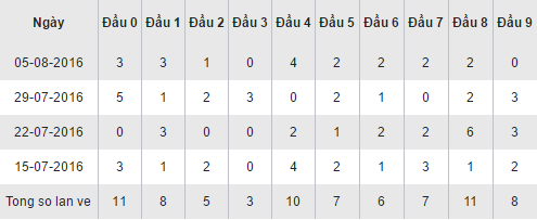 Kết quả thống kê trong 10 lần quay gần nhất ta thấy, đầu 0 và 8 đều đang giữ ưu thế với 11 lần về, trong đó đầu 0 có môt lần quay thăng hoa với số lần về khá cao (ngày 29/07 - 5 lần). Vị trí á quân trong bảng thuộc về đầu 4 với tổng cộng 10 lần về. Đầu 3 ngậm ngùi xếp hạng chót với tổng cộng chỉ 3 lần về trong duy nhất ngày 29/07. Các đầu còn lại đều về khá đều đặn.