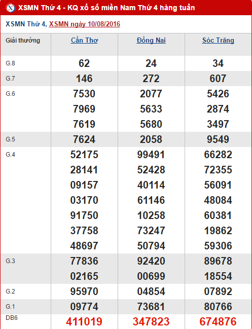 Lượt quay của XSMN hôm nay sẽ đồng loạt diễn ra tại các tỉnh Cần Thơ, Đồng Nai và Sóc Trăng lúc 16h20 chiều nay. Và trước khi đến với kết quả Xo so miền Nam hôm nay, hãy cùng anapaolaagudelo.com điểm qua tình hình kết quả của các tỉnh miền Nam ở lần quay trước ngày 10/08/2016.