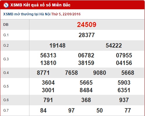 Như thường lệ, hôm nay thứ 6 ngày 23/09/2016, những vòng quay của XSMB sẽ quay trở lại với thành phố hoa phượng đỏ Hải Phòng vào lúc 18h15. Sau đây, anapaolaagudelo.com sẽ cùng các bạn đi vào bài tổng hợp, thống kê và phân tích kết quả XSMB quen thuộc hàng ngày trước giờ mở thưởng. Mở đầu bài tổng hợp sẽ là phần review lại kết quả quay thưởng ngày hôm qua 22/09/2016.