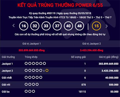 Giải Jackpot 1 của Power 6/55 đã đạt mốc 300 tỷ đồng từ kỳ quay thứ 79 ngày 30/1/2018. Từ đó tới nay đã có 16 người trúng Jackpot 2, nhận phần thặng dư từ Jackpot 1, trong đó có người trúng tới hơn 70 tỷ đồng.