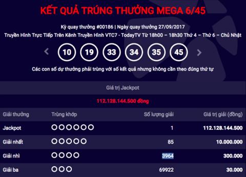 Công ty Xổ số điện toán Việt Nam (Vietlott) vừa tìm ra khách hàng trúng giải Jackpot trị giá hơn 112 tỷ đồng tại kỳ quay thứ 186 diễn ra tối 27/9. Chiếc vé trúng giải lần này có dãy số 10-19-33-34-35-45. Khách hàng trúng giải Jackpot sẽ phải nộp thuế thu nhập cá nhân 10%, tương đương 11,2 tỷ đồng.